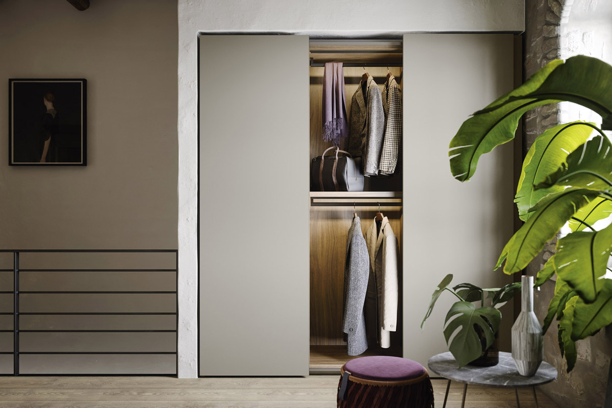 Allison è un armadio NOVAMOBILI moderno componibile ad anta scorrevole caratterizzato da un profilo sottile ed elegante che attraversa le ante scandendone la superficie.