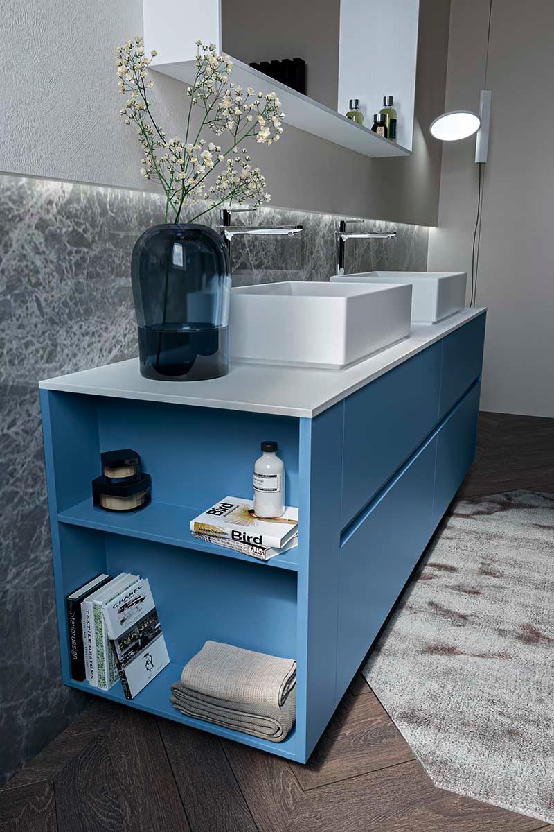 La collezione Aria è un sistema componibile che permette una progettazione su misura in base ad ogni spazio: grazie all’ampia modularità è possibile rispondere alle più diverse funzionalità dell’arredo bagno con soluzioni sempre diverse e di grande impatto visivo. La grande varietà di materiali, finiture e colori, infatti, rende Aria un sistema in grado di adeguarsi a qualsiasi esigenza estetica.