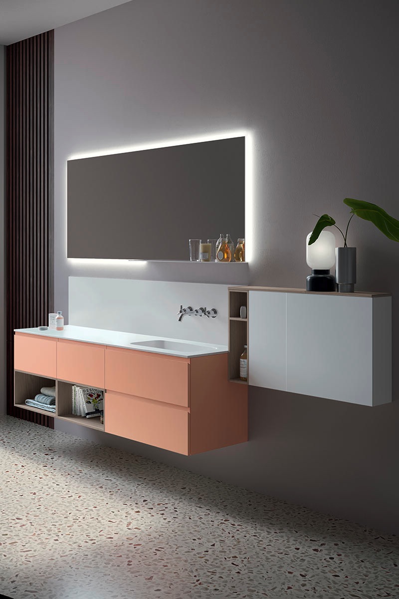 La collezione Aria è un sistema componibile che permette una progettazione su misura in base ad ogni spazio: grazie all’ampia modularità è possibile rispondere alle più diverse funzionalità dell’arredo bagno con soluzioni sempre diverse e di grande impatto visivo. La grande varietà di materiali, finiture e colori, infatti, rende Aria un sistema in grado di adeguarsi a qualsiasi esigenza estetica.