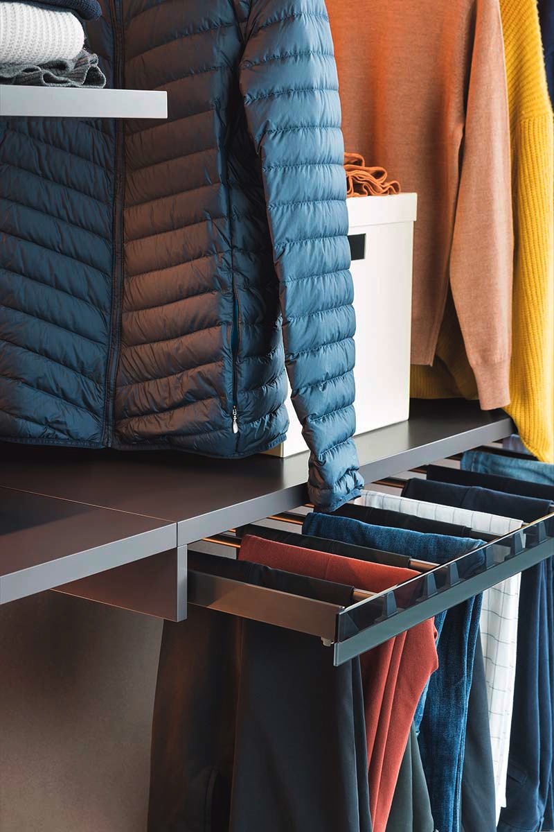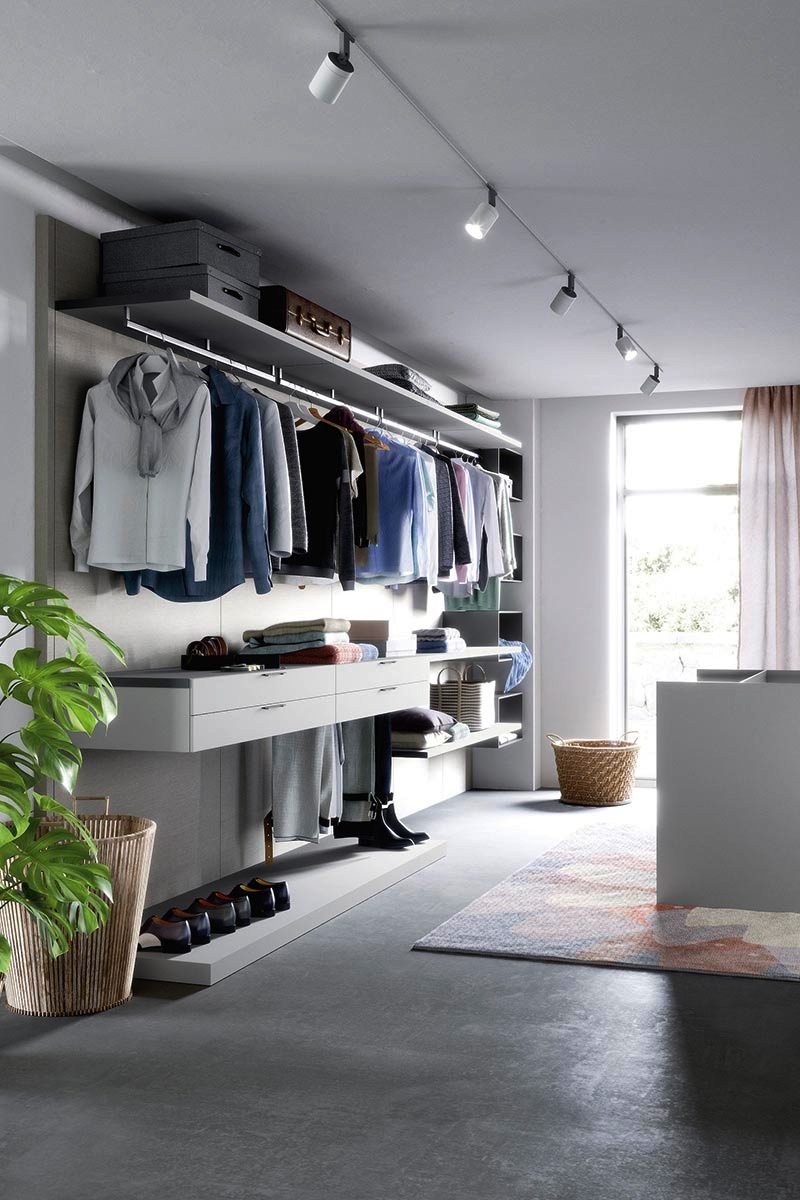 La razionalità definisce forme e funzioni. Capiente, funzionale e componibile, la cabina armadio moderna NOVAMOBILI Break può essere attrezzata con moduli angolari, luci led retro ripiani, cassetti in vetro fumé, tubi appendiabiti e accessori in finitura brunita. Il sistema a cremagliera, eliminando i fianchi di sostegno, risulta essere visivamente molto leggero.