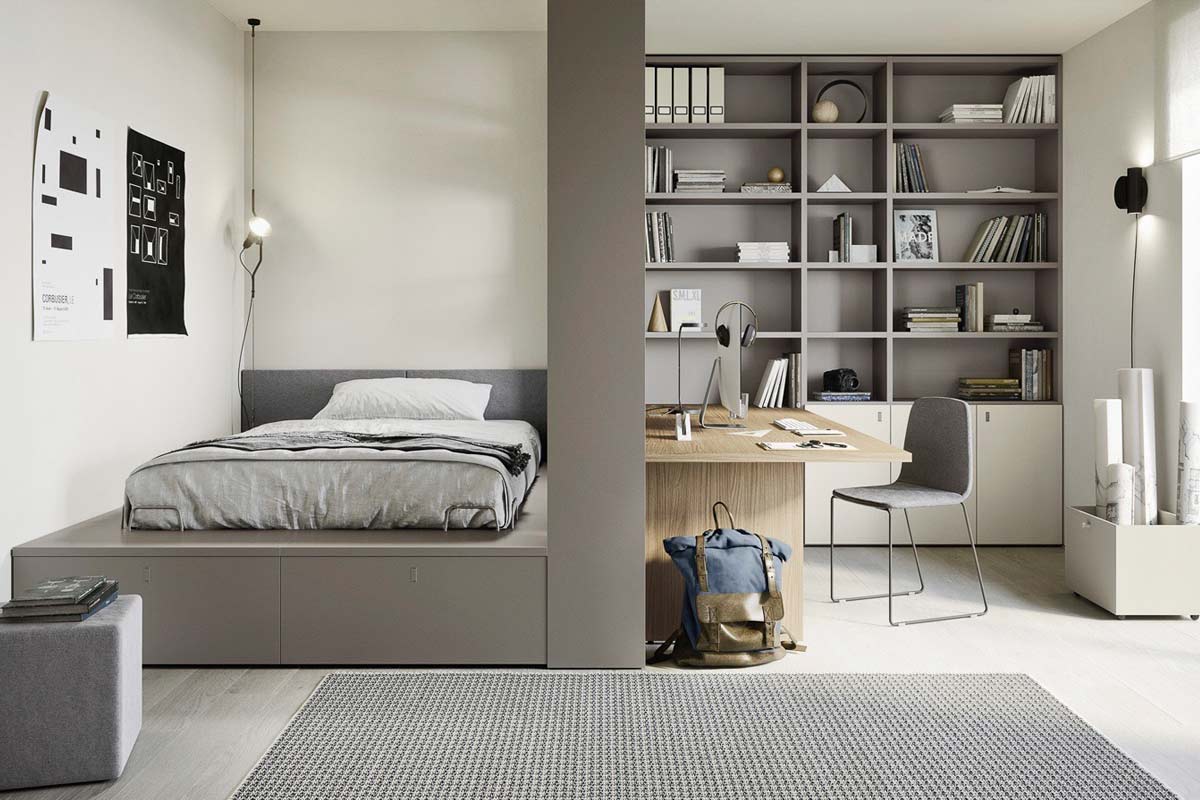 Armadi, librerie, lettini, ponti, cabine, scrivanie, basi e contenitori sono sempre disponibili in tante varianti diverse per adattarsi a qualsiasi architettura. In questo modo è possibile realizzare una stanza completamente su misura.