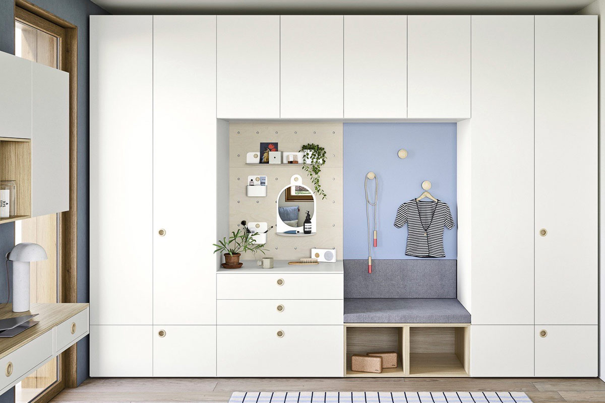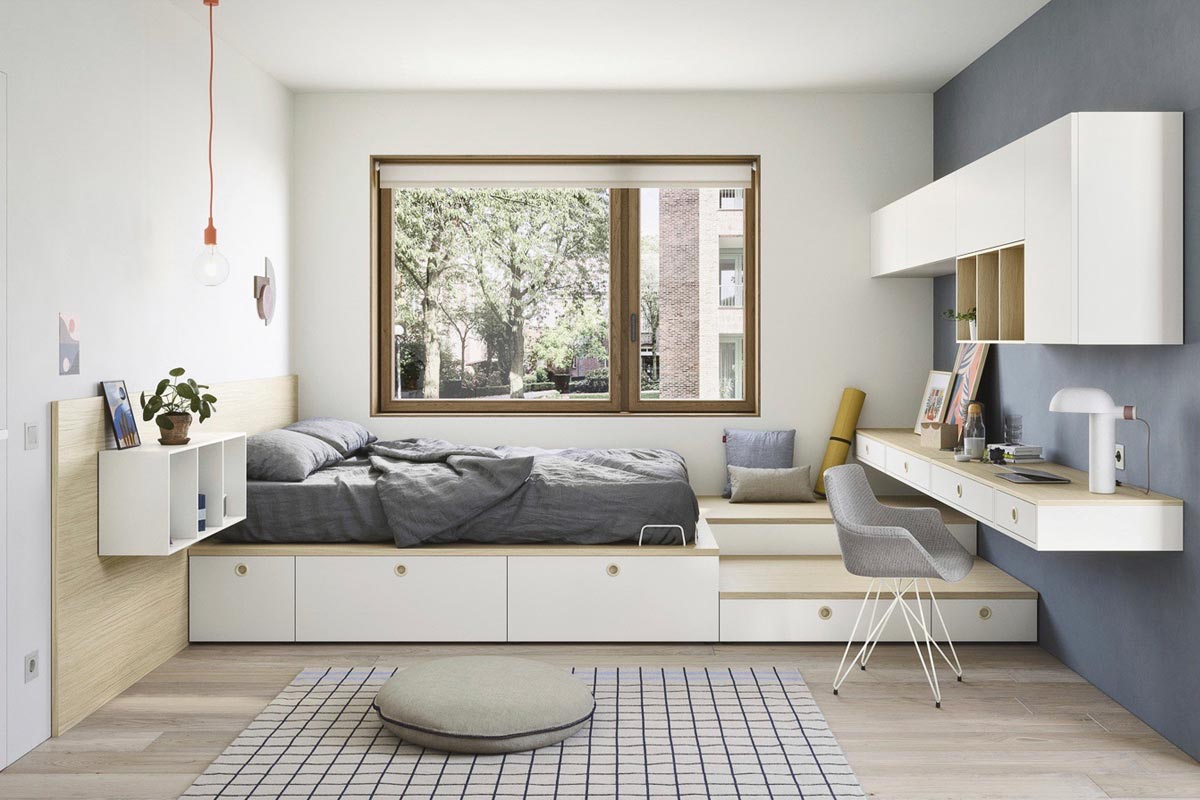 Armadi, librerie, lettini, ponti, cabine, scrivanie, basi e contenitori sono sempre disponibili in tante varianti diverse per adattarsi a qualsiasi architettura. In questo modo è possibile realizzare una stanza completamente su misura.