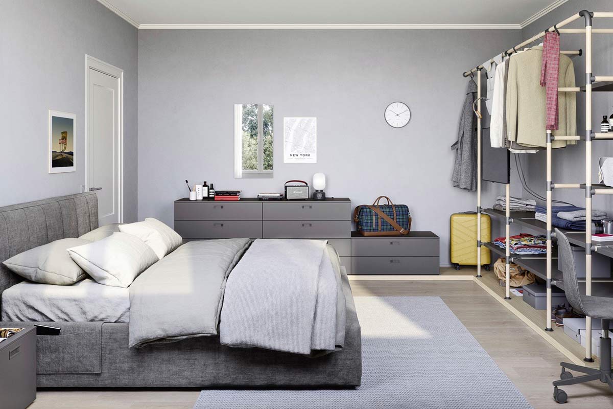 Cameretta composta da letto, cabina armadio a vista Loop System e angolo studio.