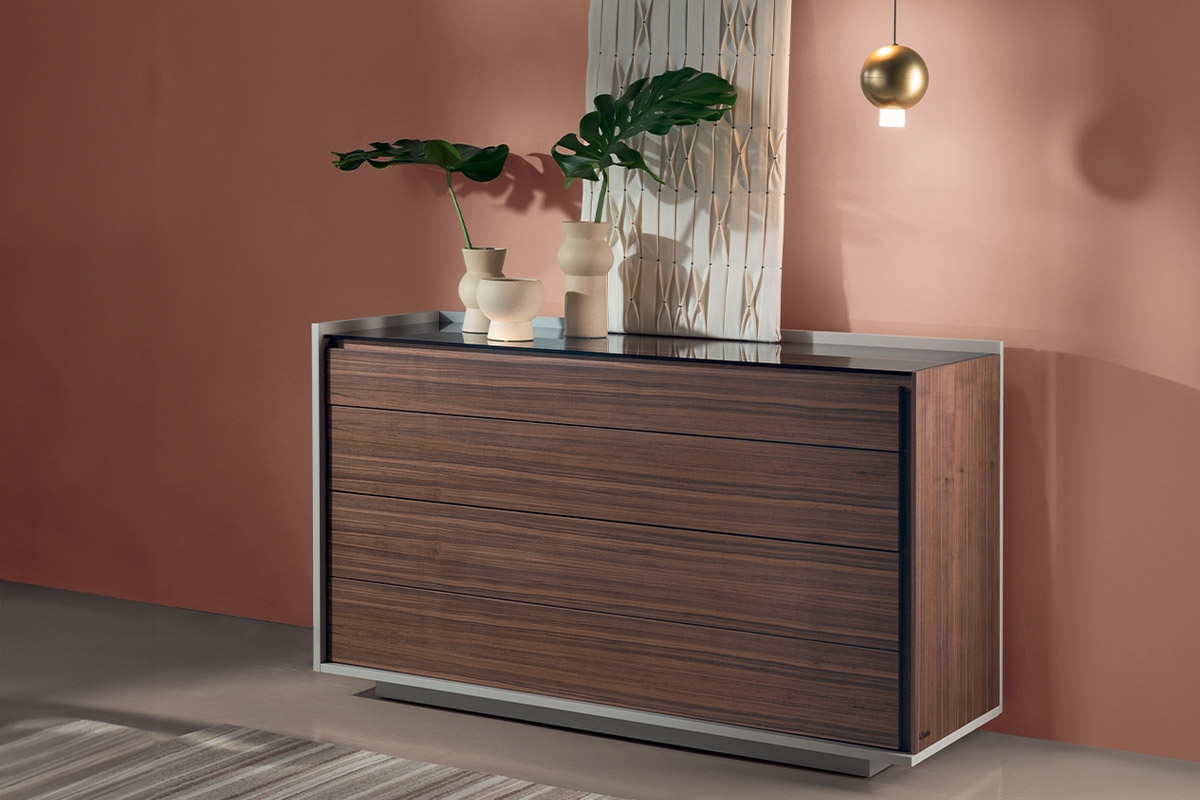 Il comò moderno Flora Le Fablier realizzato in legno di noce canaletto con dettagli laccati. È dotato di tre ampi cassetti e un cassetto con vani porta oggetti con illuminazione LED integrata all’interno del primo cassetto. Grazie a un sensore touch posizionato sul fianco del mobile, l’accensione del LED avviene con un semplice tocco. Il piano in vetro fumé aggiunge un tocco di modernità e leggerezza, enfatizzando il design e rendendolo elemento distintivo in qualsiasi ambiente.