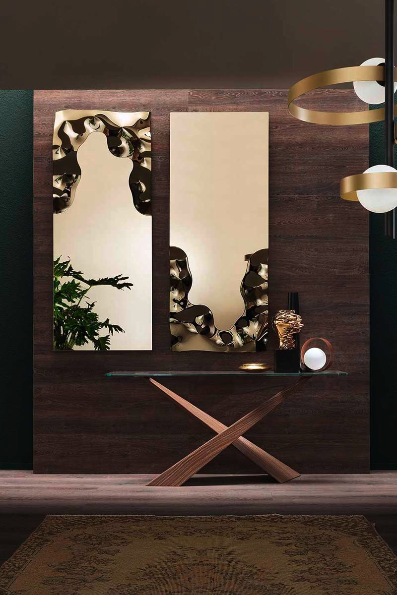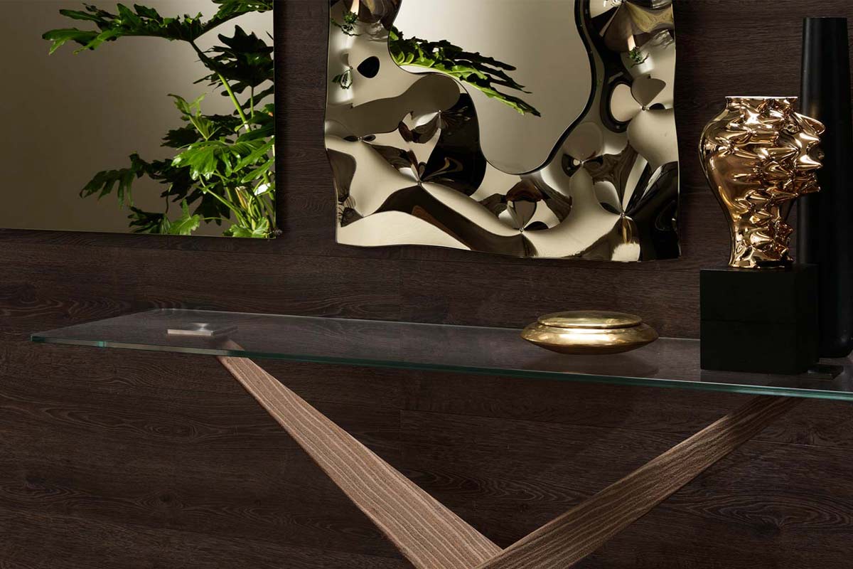 Living by Riflessi è un modello di consolle fissa con base caratterizzata da due gambe inclinate e sovrapposte tra loro in maniera asimmetrica. Le sue linee armoniche ed equilibrate rendono questa consolle un complemento unico dall’eleganza contemporanea, che imprime uno stile ricercato a ogni ambiente.