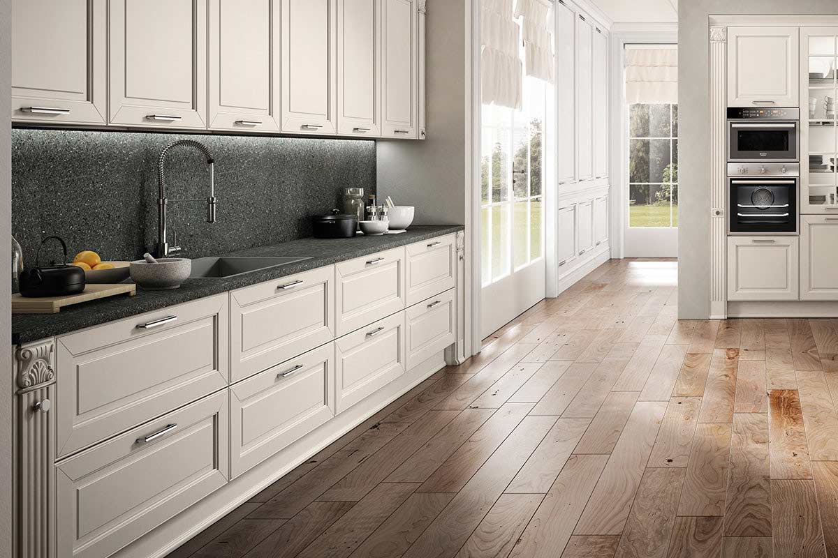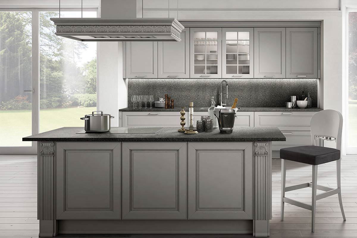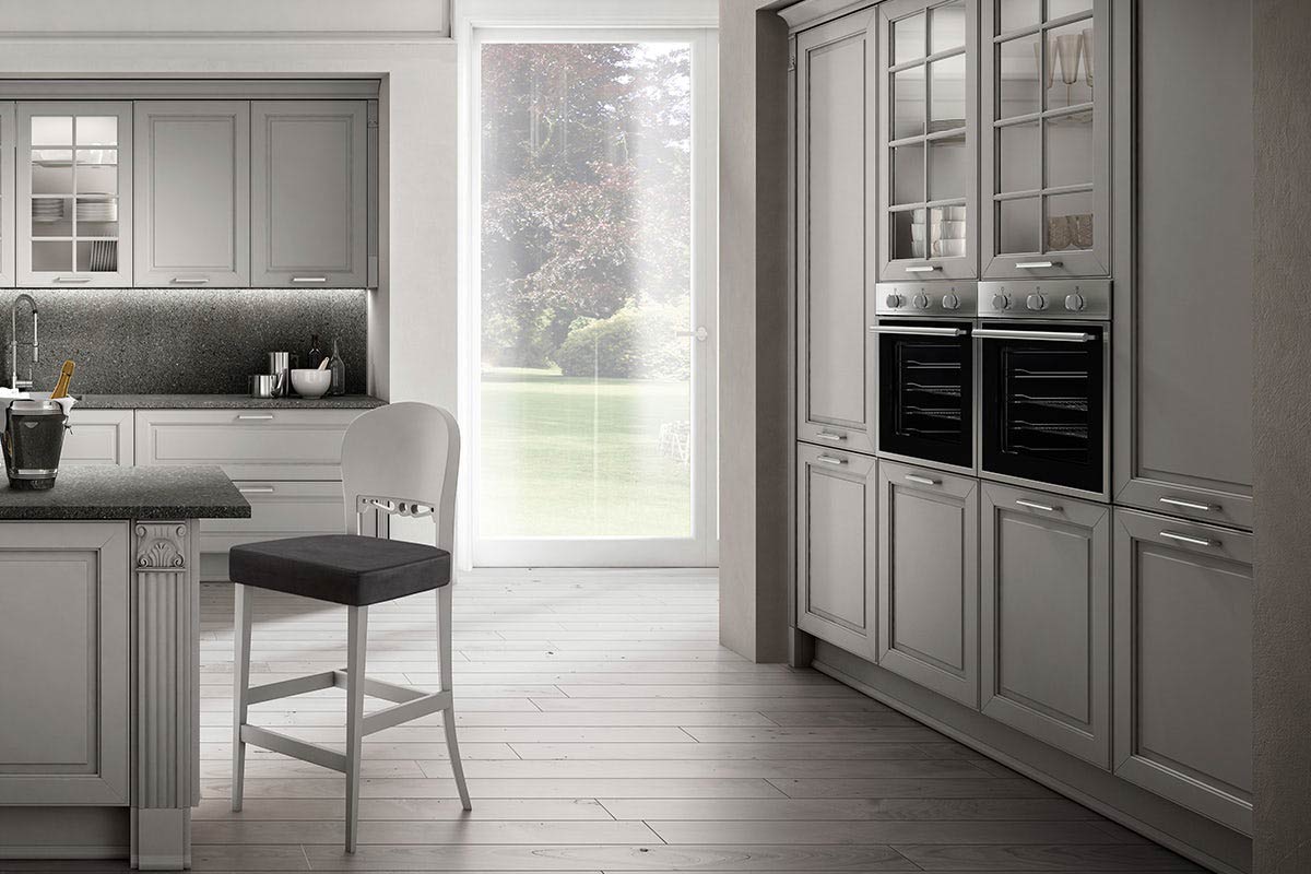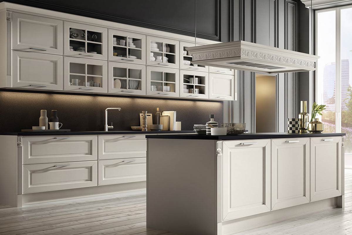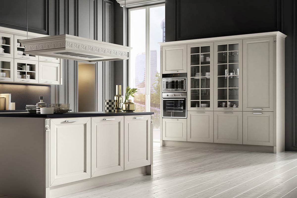 La funzionalità contenitiva di ogni elemento compositivo, dalle colonne midi, ai capitelli con vani contenitore a scomparsa, dalle vetrine, ai pensili con telaio all’inglese, dalle basi con capienti cestoni attrezzati, alle raffinate isole, arreda con armonia uno spazio dalla spiccata eleganza, impreziosita da sofisticati dettagli decorativi, come i pomoli con veri Swarovski certificati.