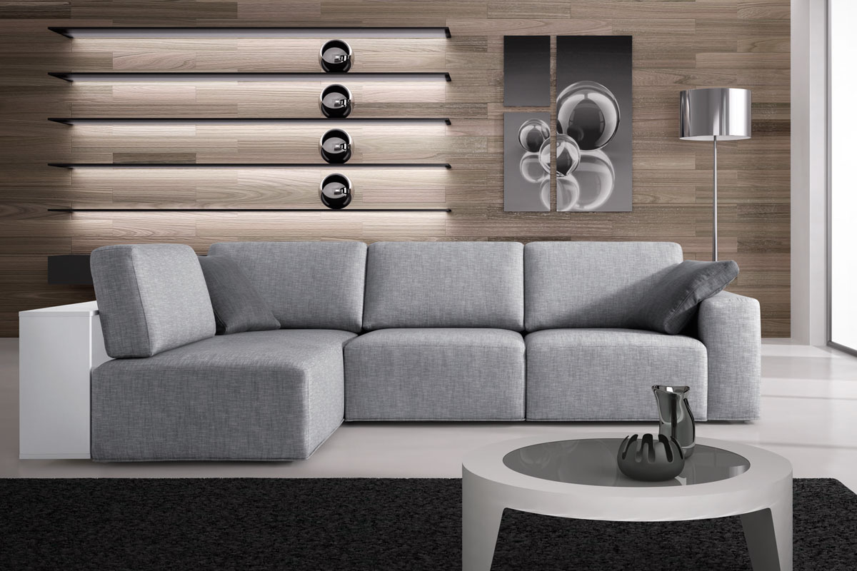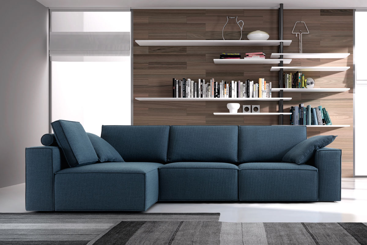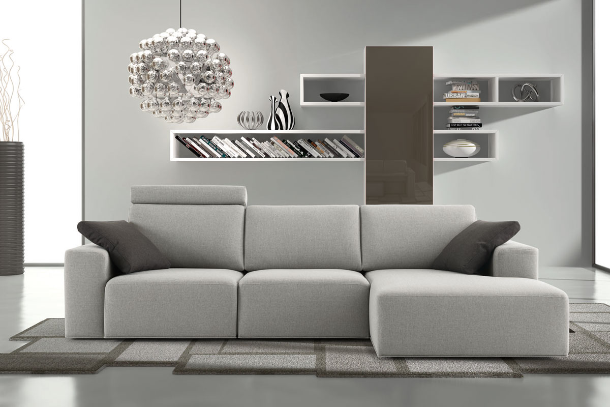 Divano moderno, dal design rigoroso ma creativo, con poggiatesta e sedute estraibili, struttura in legno, imbottitura in poliuretano espanso indeformabile
