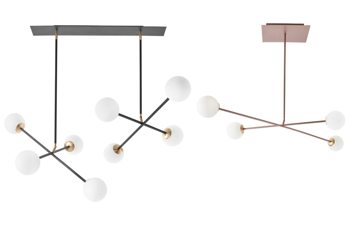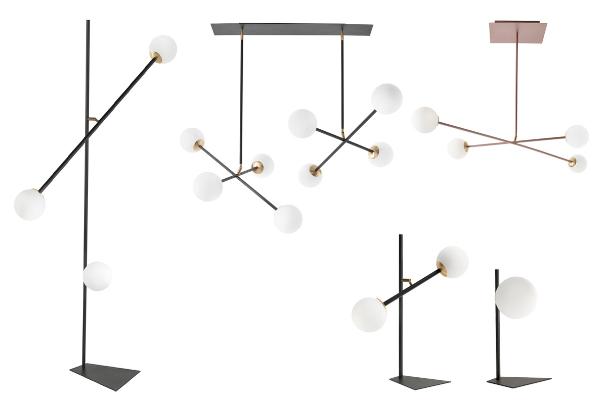 Meridian è una lampada firmata Riflessi disponibile nella versione da terra, d’appoggio (ad una o due luci) e a sospensione (a quattro o otto luci).