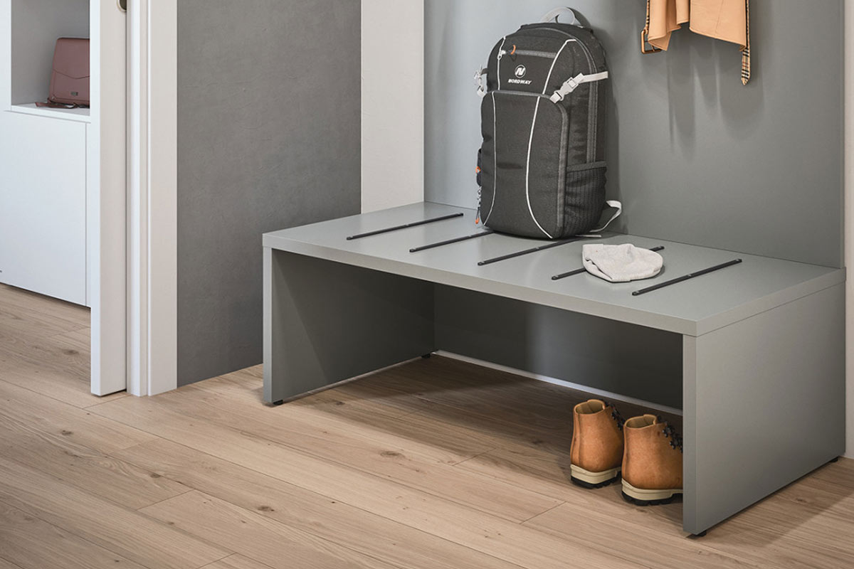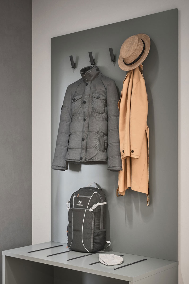Progetto 8 è composto da un elemento a parete con appendiabiti e una panchetta che funge sia da seduta che da porta valigie.