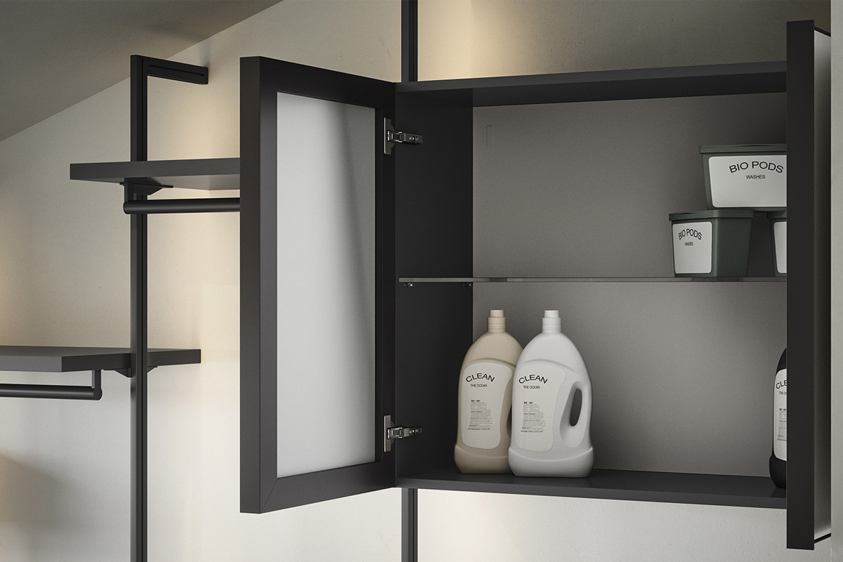 L’ambiente lavanderia richiede una progettazione dedicata all’organizzazione dello spazio in modo funzionale e intelligente: grazie ai sistemi componibili è possibile realizzare varie soluzioni in base ad ogni esigenza. Oltre a mensole e ripiani, è possibile aggiungere vari elementi come appendiabiti, specchi, basi e ante per elettrodomestici come lavatrice, asciugatrice e asse da stiro.