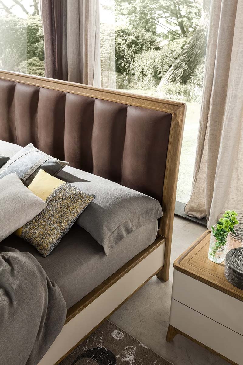 Il letto moderno Deva firmato Le Fablier si esprime in un design nordico ispirato agli anni 30, tipico della collezione moderna Fiori di Loto. La testiera è impreziosita da un’imbottitura ricercata e avvolgente, incorniciata da una elegante bordatura in legno rovere massello.