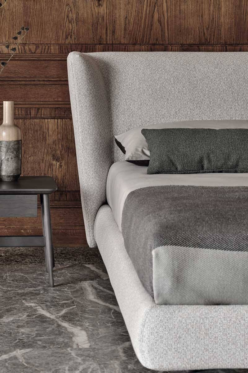 Royal, un letto imbottito moderno che si distingue per il gioco di proporzioni tra testata e giroletto. L’apparente sospensione da terra rendono Royal un letto dal gusto elegante e contemporaneo.