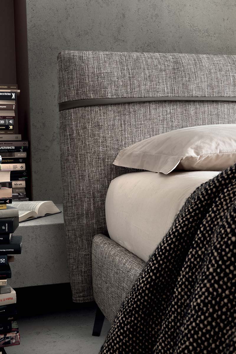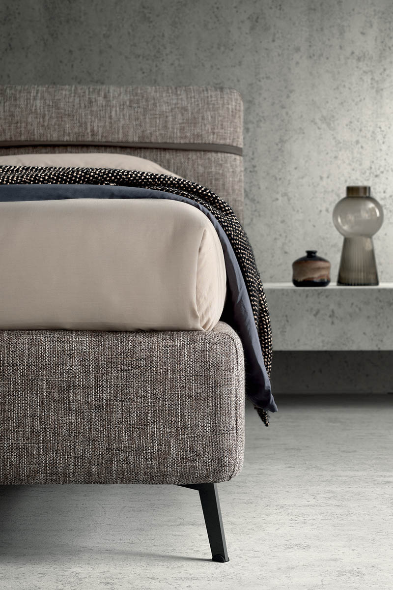 Chop è un letto matrimoniale moderno completamente sfoderabile con struttura in legno stagionato e agglomerato in classe E1. Sia la testata che il giroletto sono imbottiti e personalizzabili in una vasta gamma di materiale e colori. Anche il piedino è disponibile in diverse forme in grado di rispondere ad ogni esigenza estetica e funzionale.