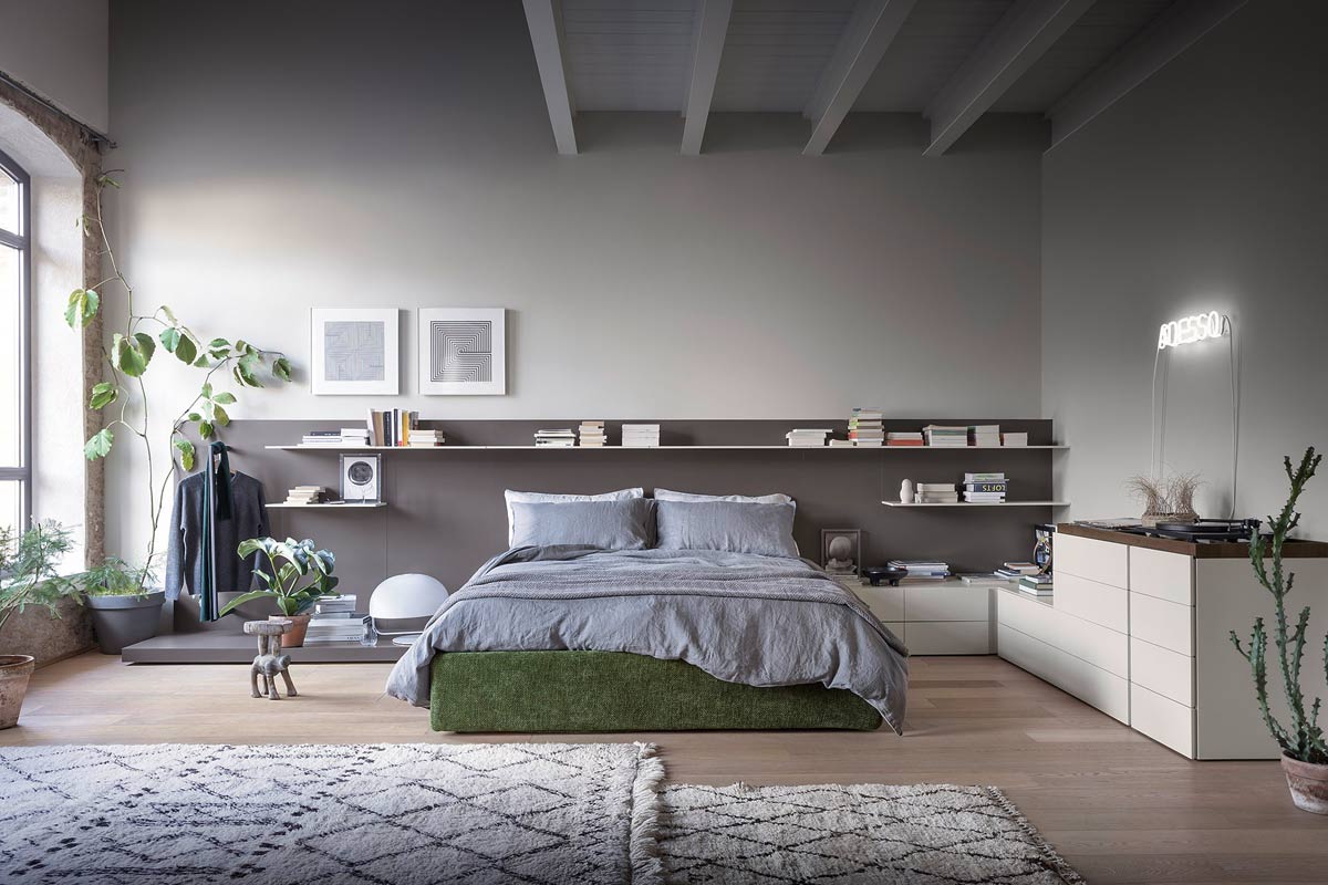 Il sistema a Boiserie Easy NOVAMOBILI consente di creare diverse soluzioni da abbinare ad un letto in appoggio anche con testiera imbottita. I pannelli a muro, con o senza mensole, si possono combinare con i moduli cassetto per creare pareti attrezzate e soluzioni d’arredo complete.