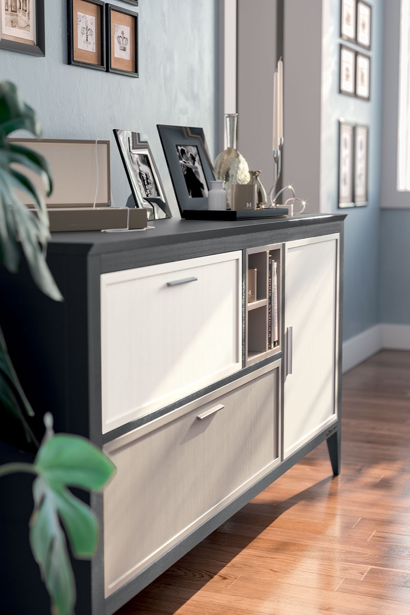 La madia Veronica Le Fablier si distingue per il suo design caratterizzato dal movimento fluido dell’anta e dei due cestoni. Questo elemento aggiunge vivacità e interesse visivo all’ambiente, creando un’atmosfera vibrante e accattivante. Grazie alla sua forte personalità e il suo design distintivo, Veronica non passa inosservata e si rivela il punto focale della zona giorno.