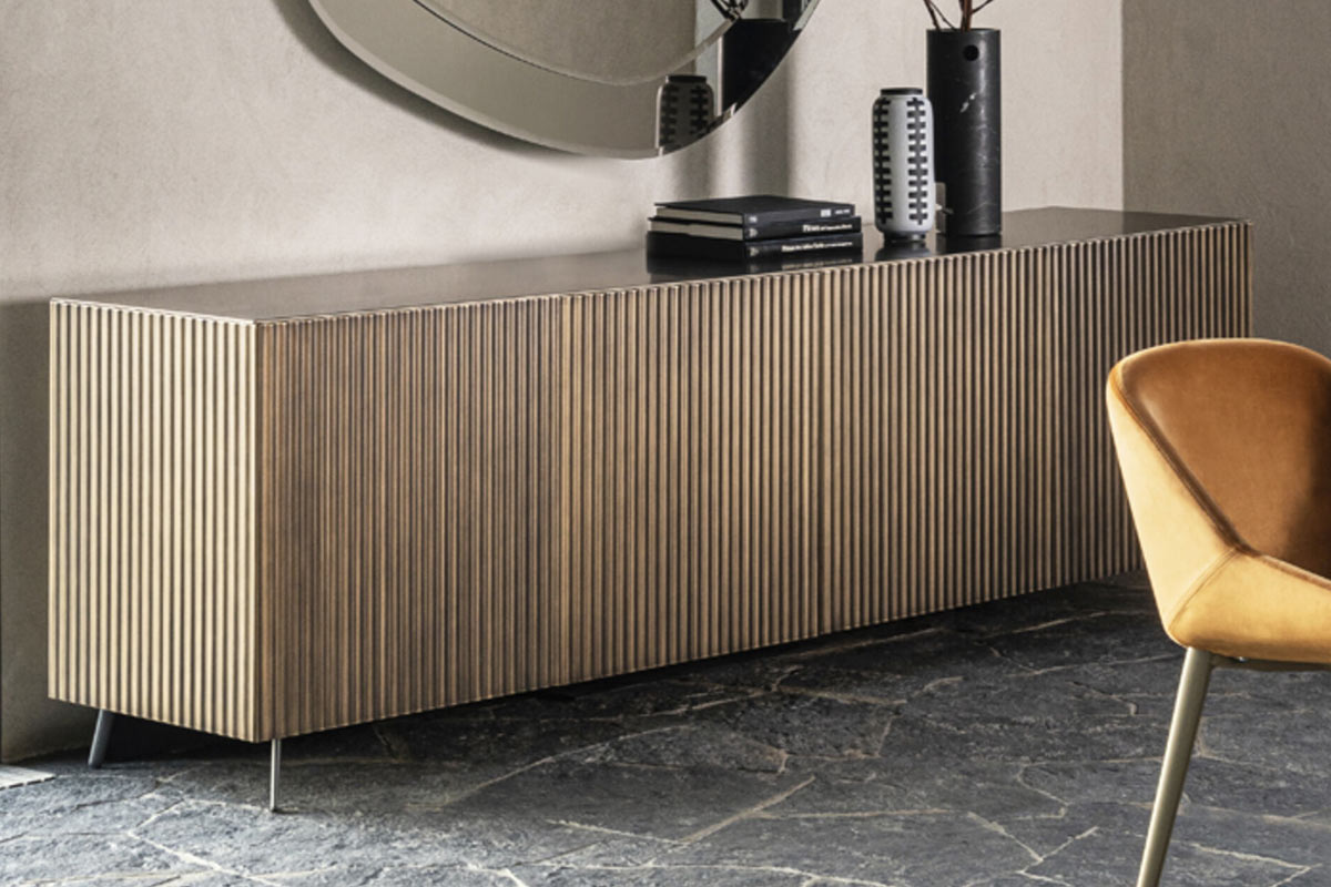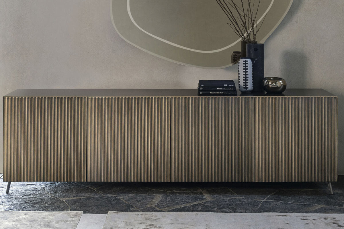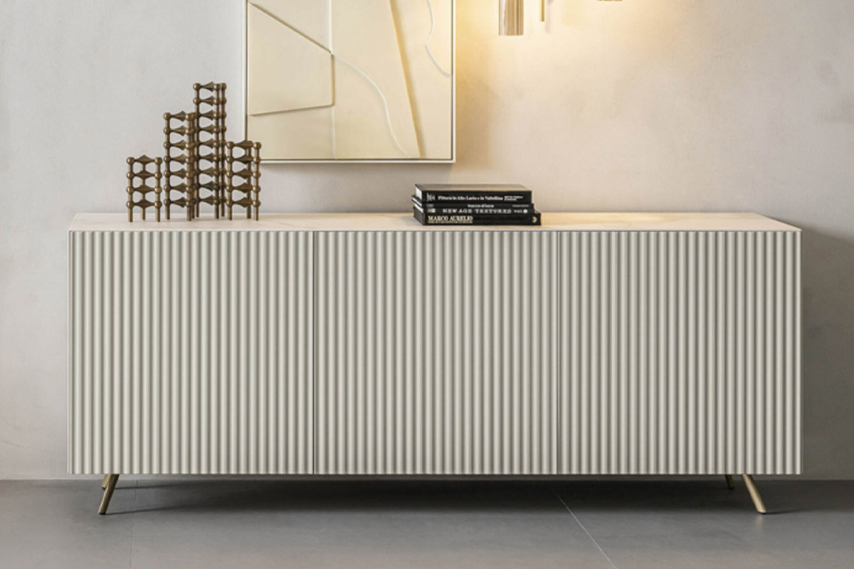 La madia Onda è l’espressione perfetta dell’attenta ricerca formale e tecnologica da sempre alla base dei prodotti firmati Riflessi. Onda, con il suo gioco di linee, trova ispirazione nel mondo della geometria arricchendolo con la tridimensionalità dell’interessante gioco di chiaroscuri dati dalle incisioni verticali sulle ante e sui fianchi.