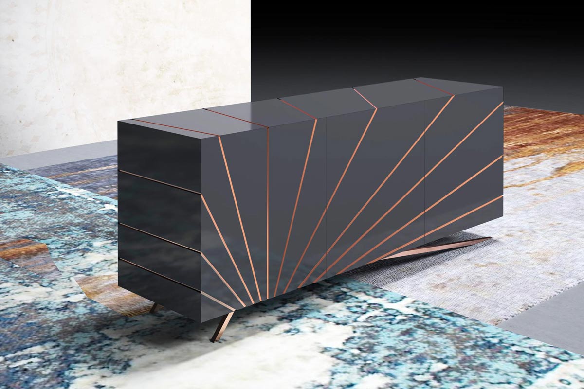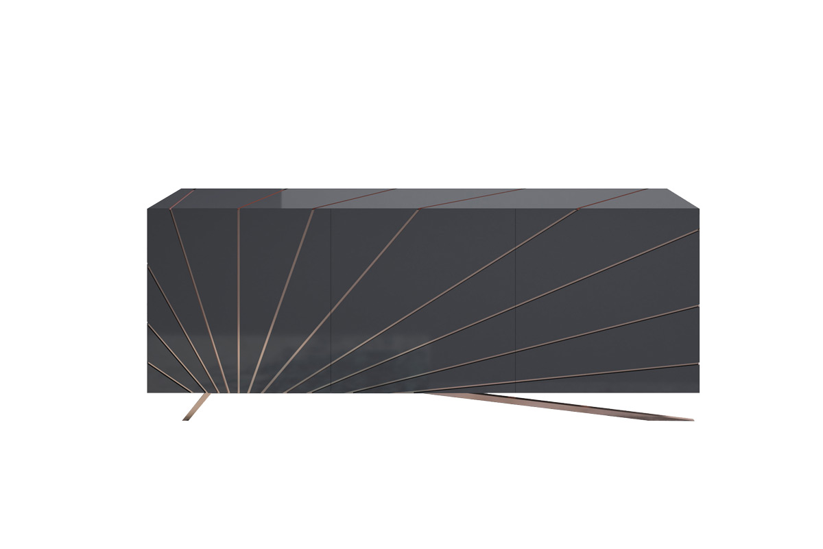 Ispirata ai raggi del sole, la madia moderna Solaris by Riflessi è un modello che presenta un’incisione a raggiera color oro rosa che si staglia su tutte le superfici della madia. Ante, top e fianchi sono realizzati con con taglio a 45 gradi. Apertura push-pull, ripiani interni in cristallo trasparente. A scelta anche un cassetto interno con unica finitura in tortora effetto pelle.