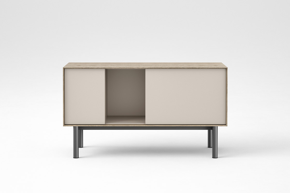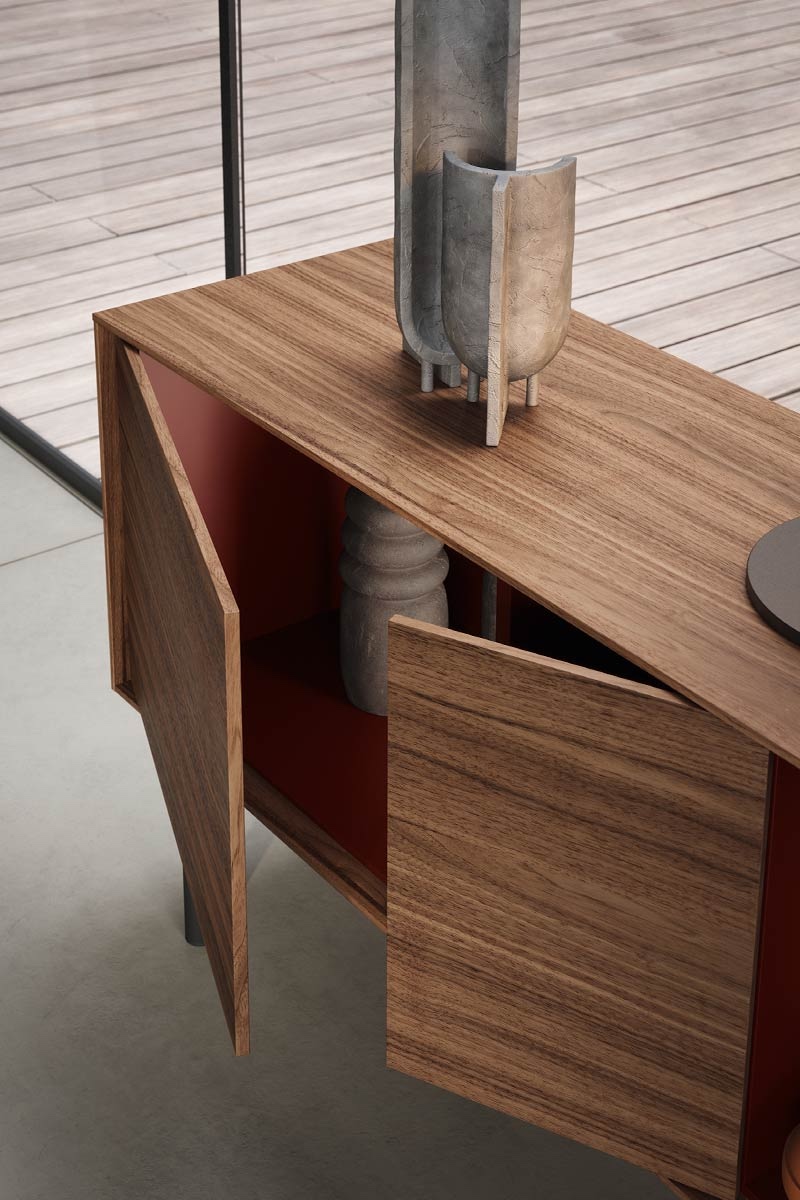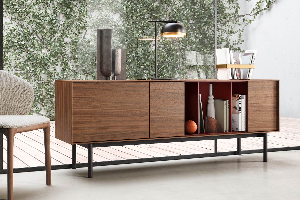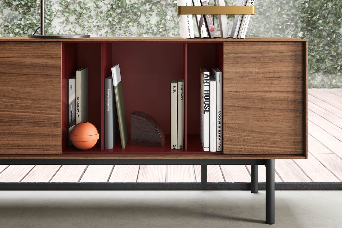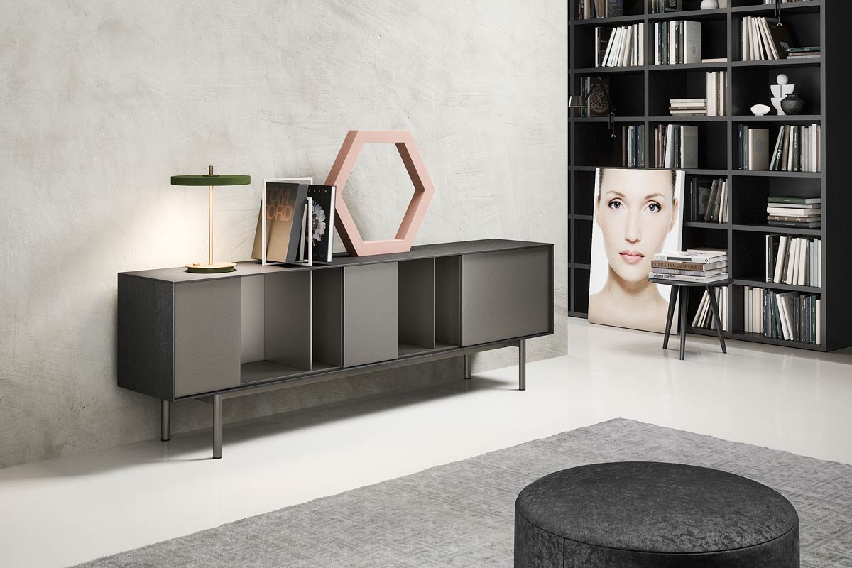 Reverse, una madia NOVAMOBILI dal sapore degli anni ’50 che alterna parti chiuse a vani a giorno creando infinite possibilità di composizione e contrasti cromatici.