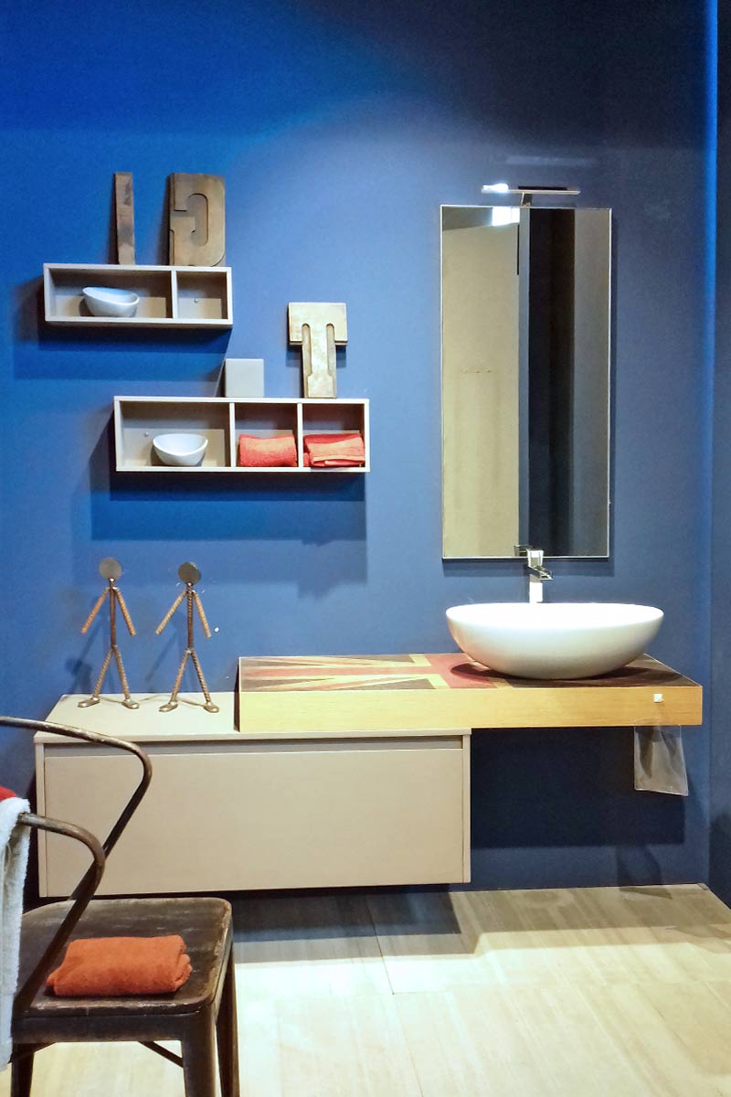 Arredo bagno composto da base sospesa 1 cassettone con gola l.105 p.51 h.38 cemento cacao + top porta lavabo in appoggio l.120 p.51 sp.10 (staffe comprese) rovere oslo con serigrafia + lavabo soprapiano sp.170 softly + pensile a giorno l.70 p.14 h.20 + pensile a giorno l.50 p.14 h.15 + specchiera liscia l.50 h.00 con interruttore + faretto f31 cromo led.