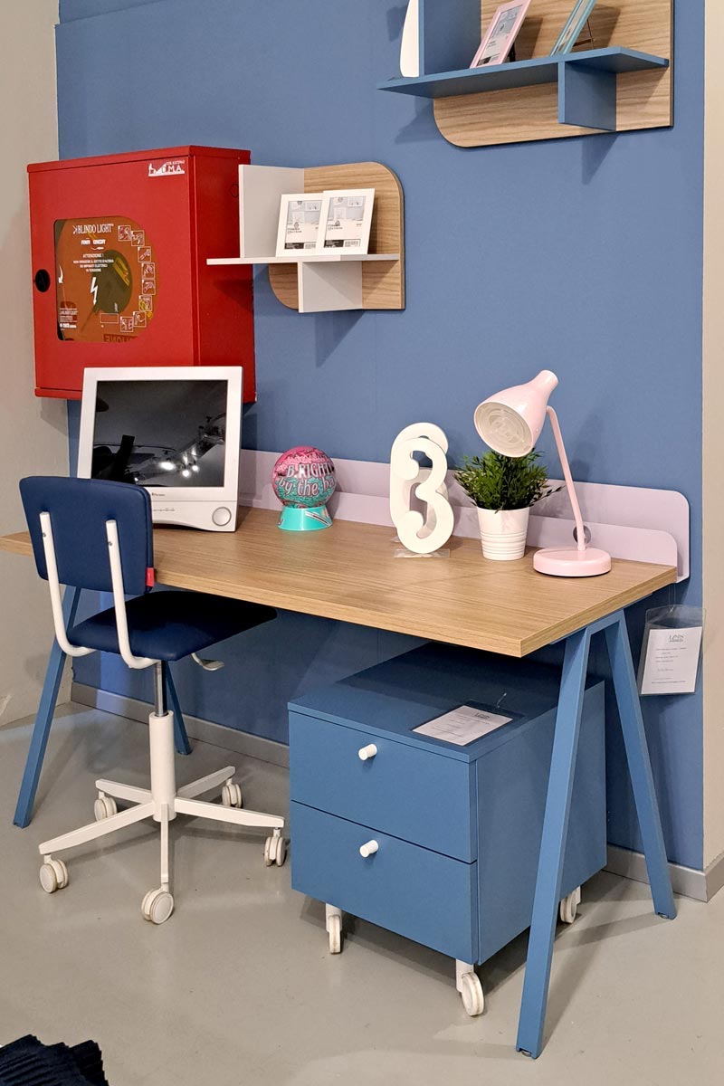 Zona studio composta da scrittoio con gamba Ask a V, cassettiera a due cassetti e due casellari Cloud