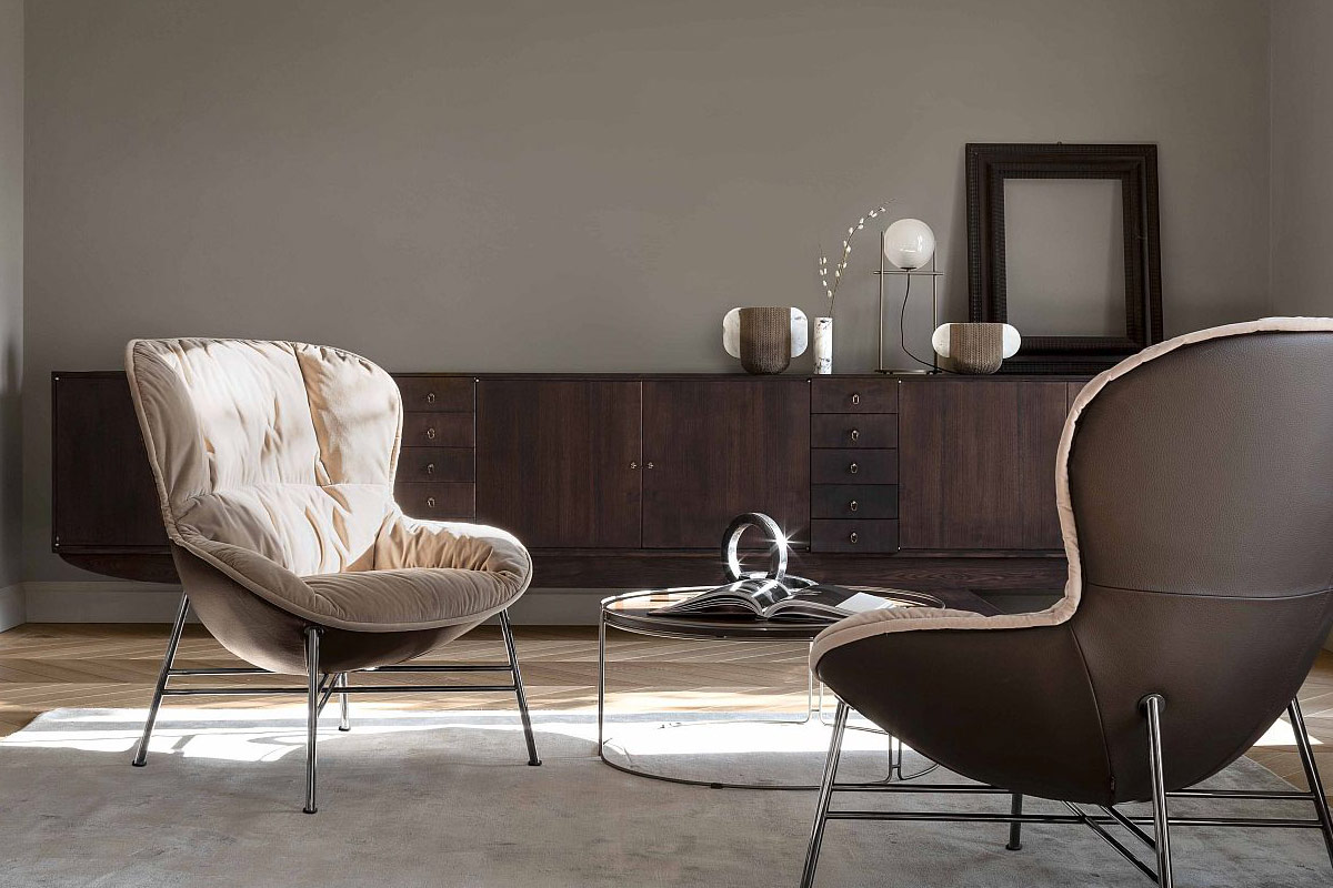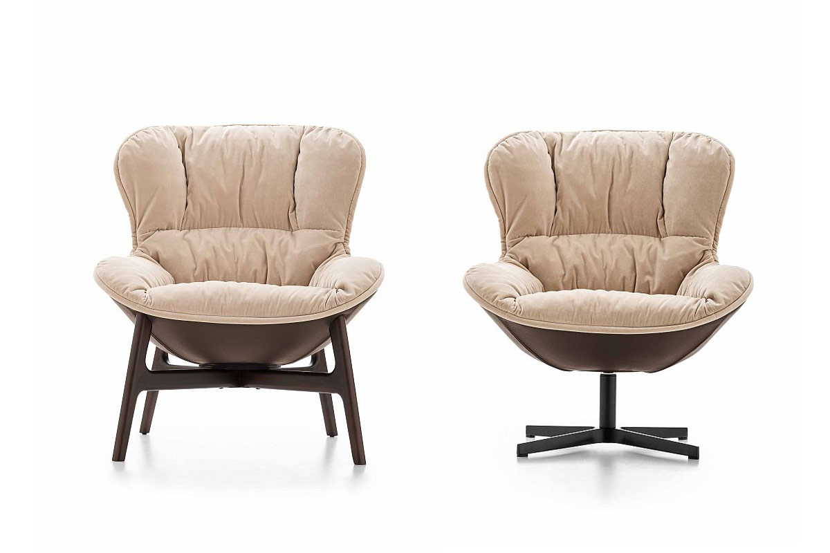 Softy, una poltrona dal forte impatto visivo e gusto vintage che esprime solidità e morbidezza. La generosa imbottitura della seduta in contrasto col basamento sottile in metallo dà vita ad un gioco di sensazioni materiche che le donano grande eleganza.