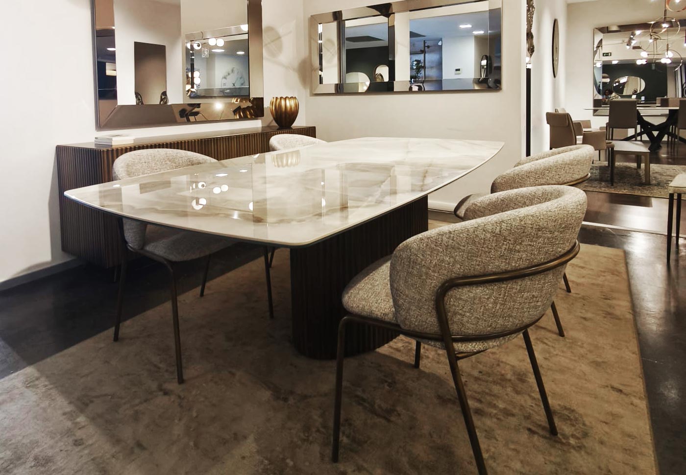 _Nei tavoli Shangai e Living, Riflessi fonde estetica e innovazione: il piano in ceramica cela un sistema di cottura a induzione integrato, che permette di cucinare direttamente al tavolo. Una soluzione raffinata, plug-and-play e discreta, che trasforma la convivialità in un’esperienza di stile contemporaneo.