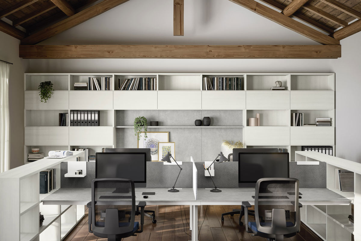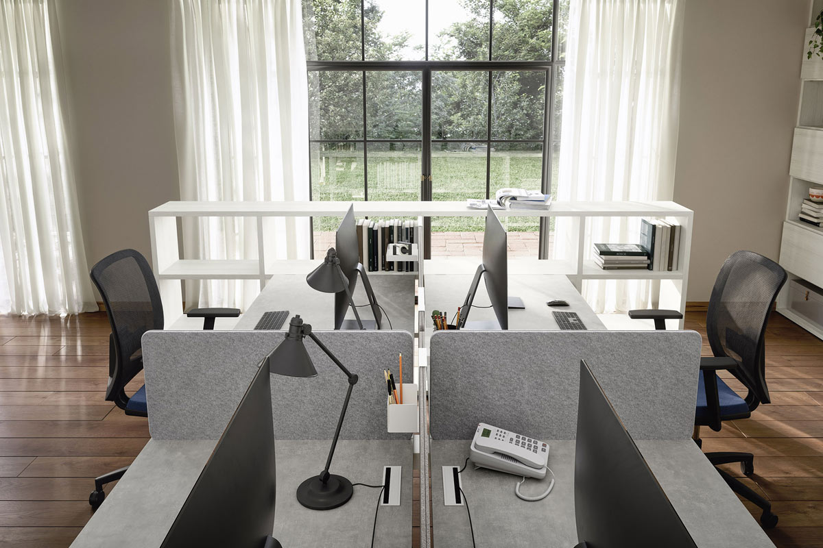 Grazie ai sistemi componibili è possibile progettare un’ampia gamma di scrivanie per l’ufficio o per la zona studio di casa. Ogni modello è personalizzabile con vari accessori in grado di rispondere alle diverse esigenze, come divisori in pannello o imbottiti fonoassorbenti, divisori casellario, basi con portaoggetti, schedario estraibile e alzata.