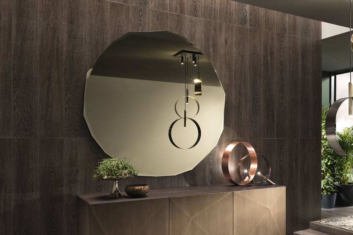 Un design che resiste alla prova del tempo, che plasma materiali preziosi per creare specchi iconici: Pandora è un modello firmato Riflessi con cornice perimetrale a bisellatura irregolare. Disponibile in cristallo specchiante o bronzato.