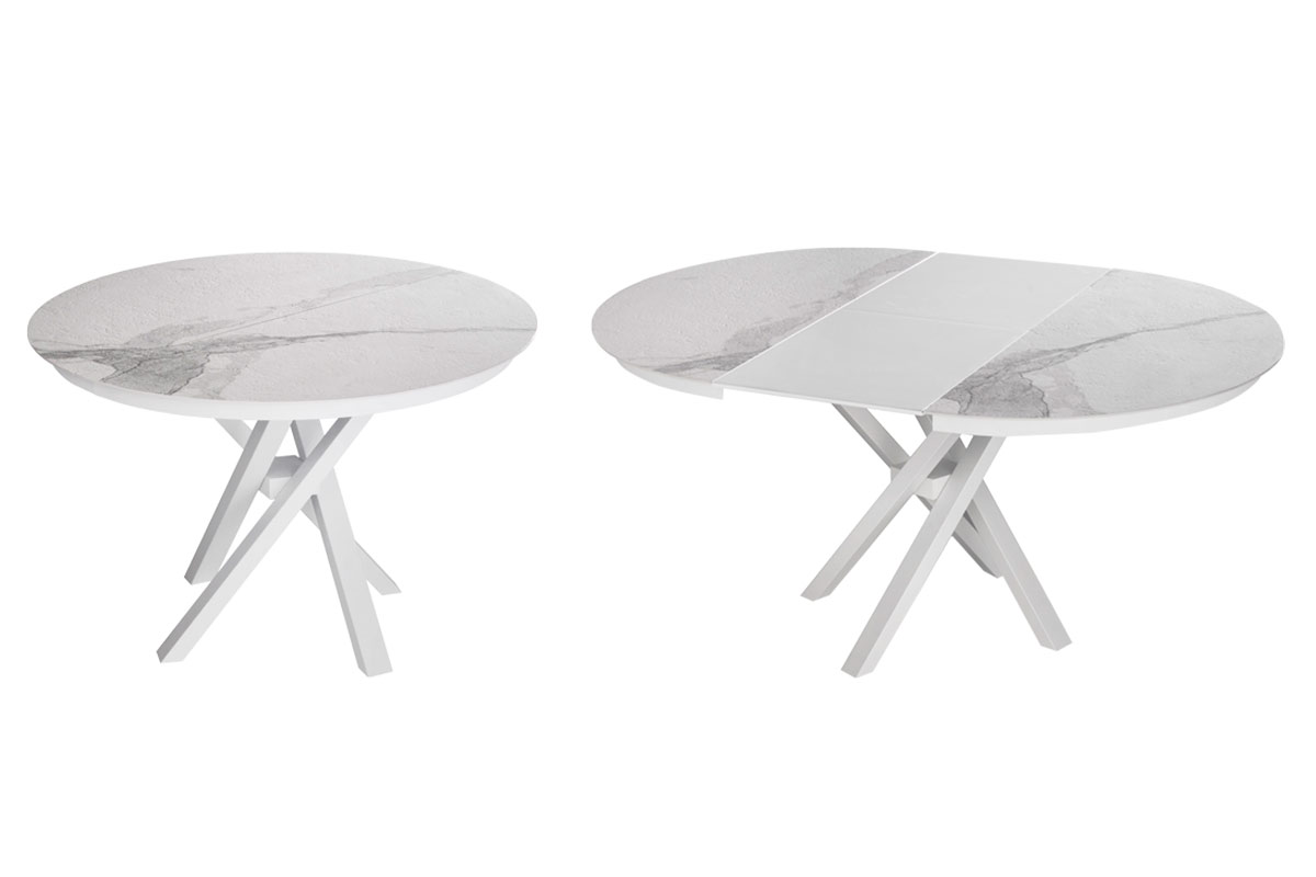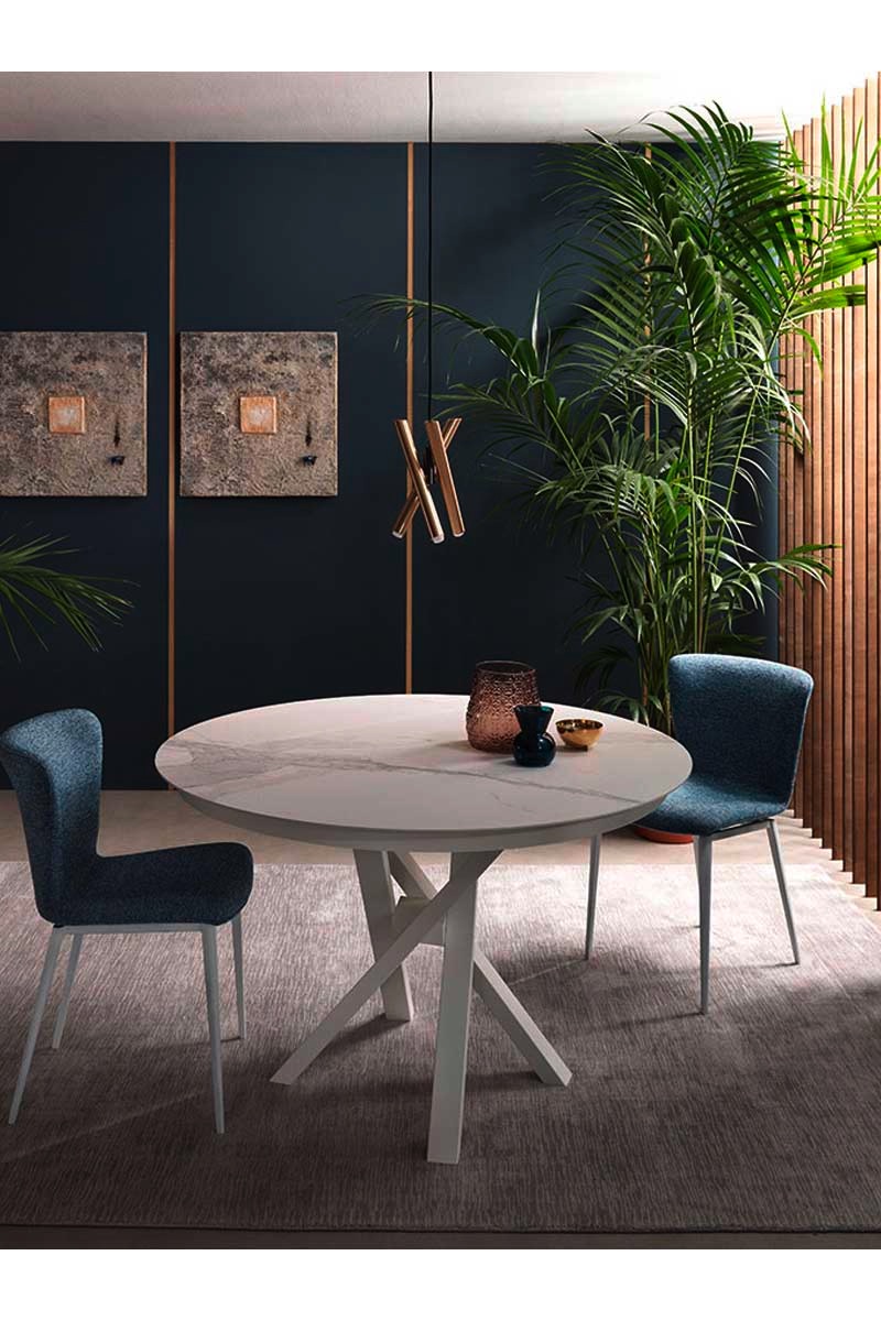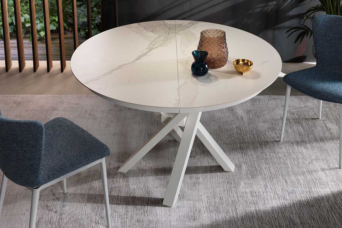 Bellezza e praticità si fondono per creare il tavolo Round by Riflessi. Con la base Shangai, composta da gambe inclinate e sovrapposte tra loro in maniera asimmetrica con snodo centrale, Round diventa un elegante oggetto d'arredo per la zona living.