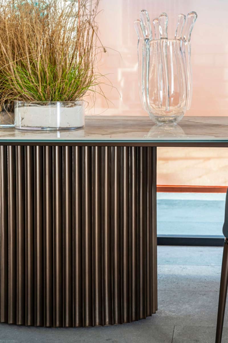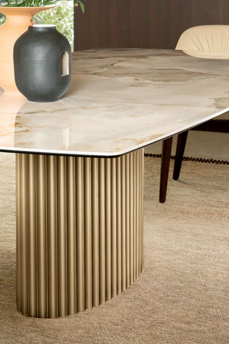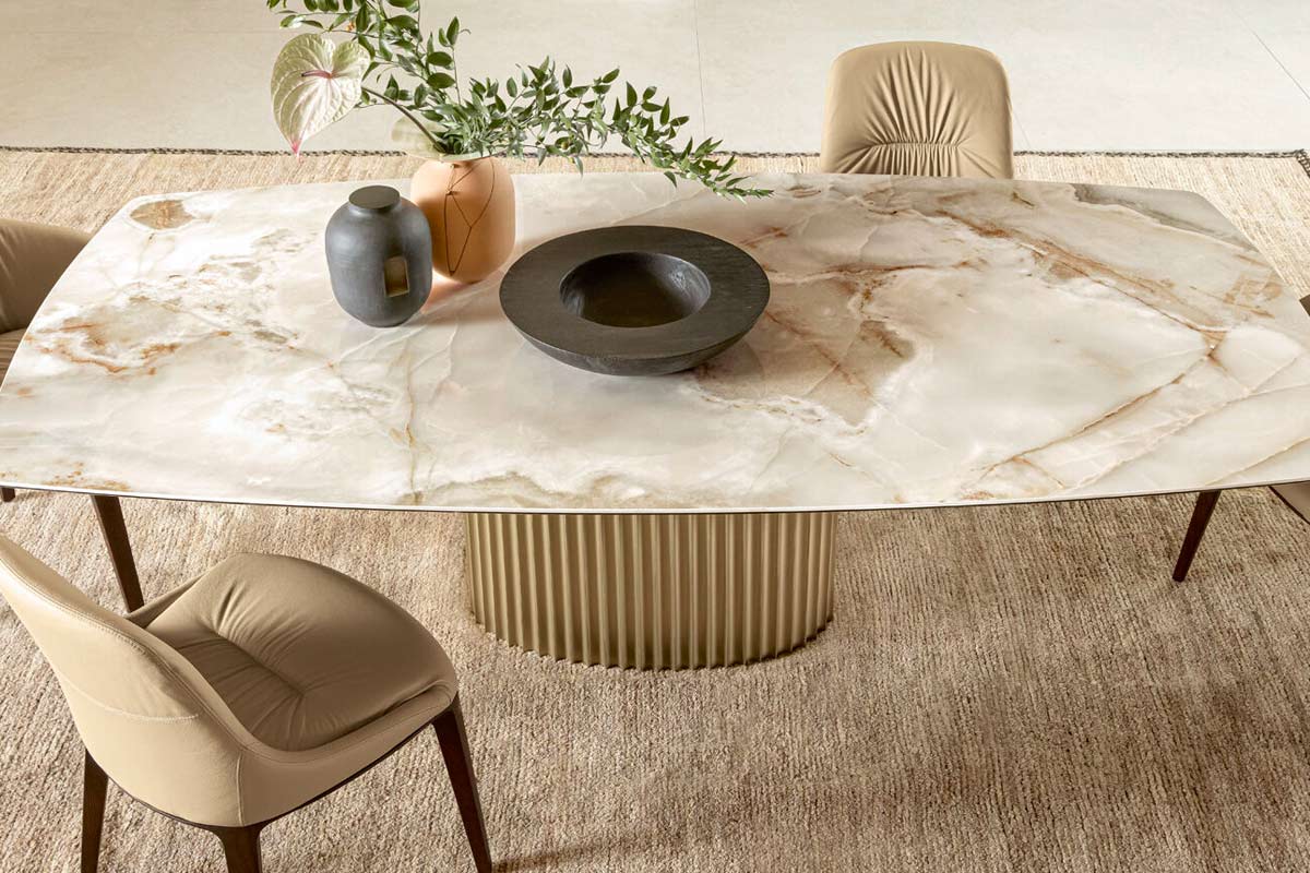 Enea è un tavolo moderno in cui materiali e forme si incontrano in un’armonia perfetta. È composto da una colonna centrale che, grazie alla sua presenza scenografica, cattura l’attenzione: le sue scanalature profonde e ben definite, donano allo stesso tempo una sensazione di movimento e solidità. Disponibile con ripiano rotondo, a botte o ovale.