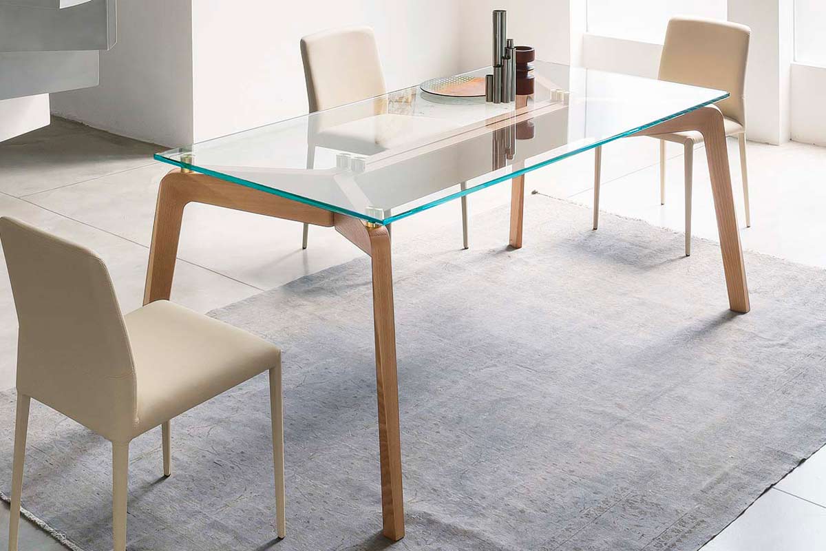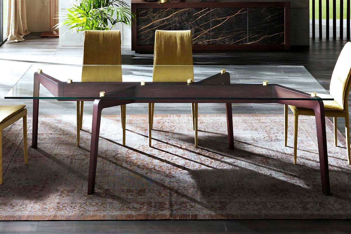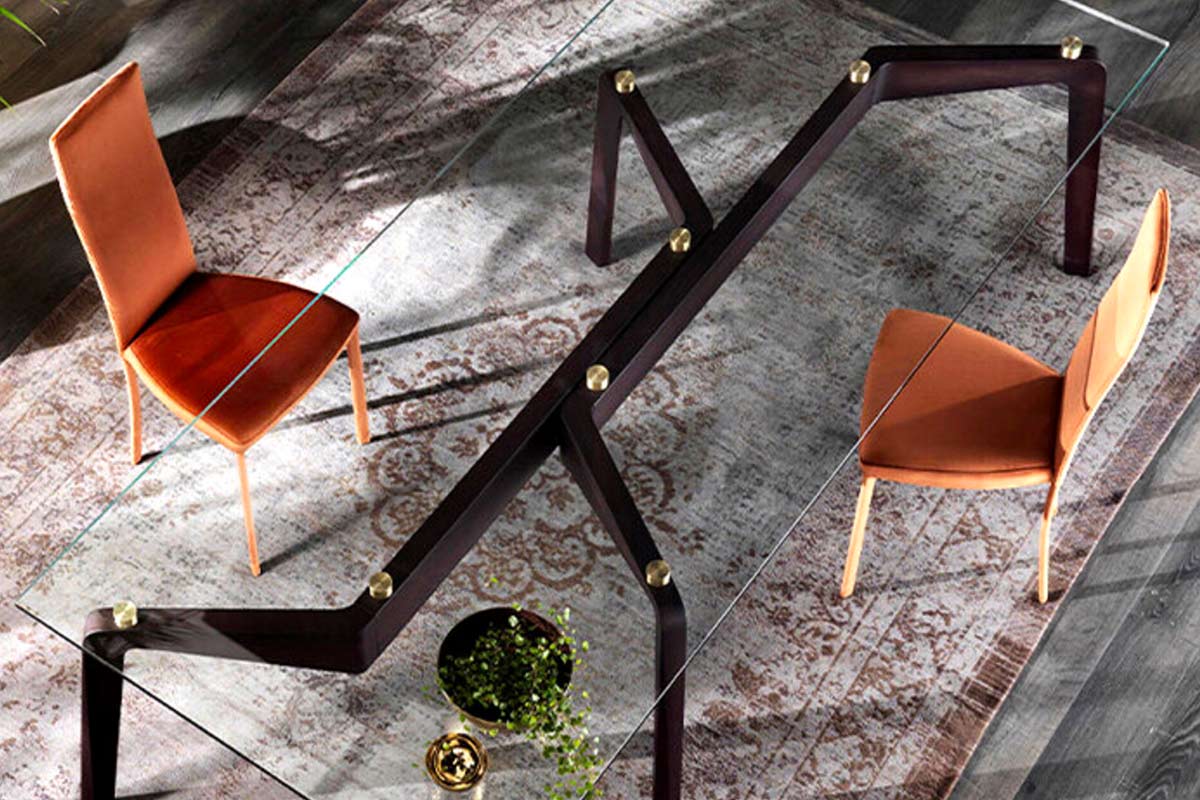Glide, un tavolo moderno caratterizzato da un’ampia trama di curve morbide e linee dritte che ne disegnano la base. Le gambe del tavolo, formate da due strutture simmetriche, diventano oltre che elementi funzionali anche dettagli estetici caratteristici, così come il contrasto tra i toni caldi del legno e la luminosità del cristallo che esalta l’elegante trama disegnata dalla base.