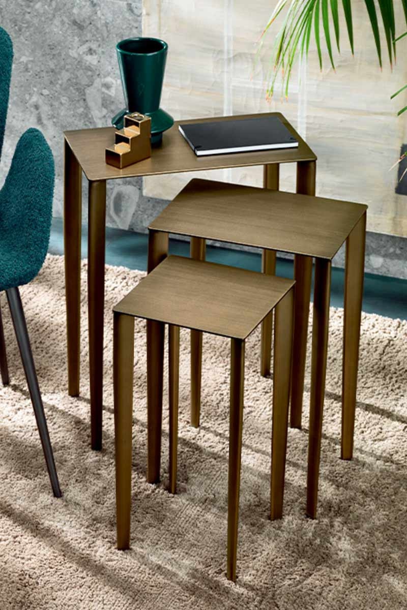Il set di tavolini Tris si caratterizza per una linea decisamente slanciata dalle proporzioni leggere ed equilibrate. La lunghezza delle gambe, quasi esasperata, è associata a una linea essenziale e priva di orpelli.