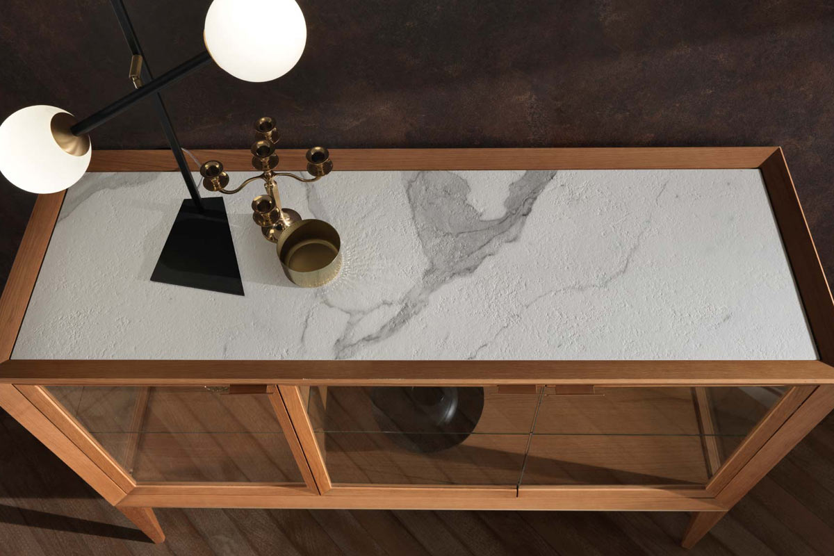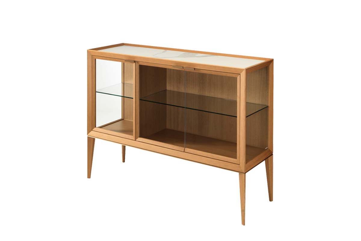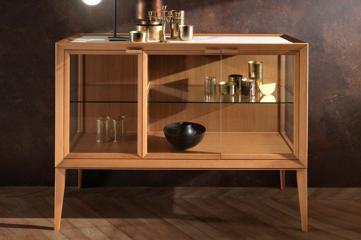 Medea è una vetrina moderna Riflessi con struttura in legno e schienale, ante, top, fianchi e ripiani in cristallo. Medea è realizzabile sia in versione alta che bassa. La versione bassa è disponibile anche con top in ceramica bianco statuario.